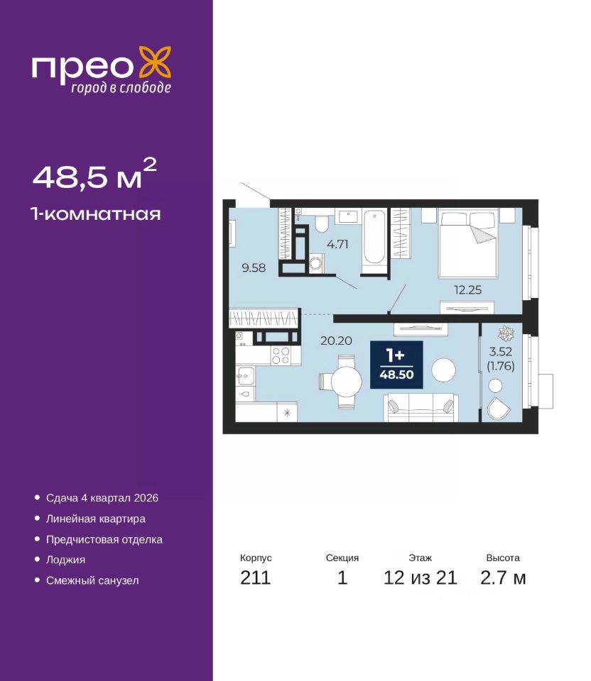 1-комн. квартира от застройщика с предчистовой отделкой в ЖК "Прео" на 12 этаже. Общая площадь: 48.5 кв.м., жилая: 12.25 кв.м., площадь просторной кухни-столовой: 20.2 кв.м. Все окна выходят на одну сторону. В квартире одна лоджия, один совмещенный санузел. Высота потолков 2.7 м.