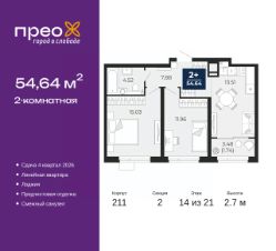 Просторная двухкомнатная квартира с предчистовой отделкой в ЖК "Прео" на 14 этаже. Общая площадь: 54.64 кв.м., жилая: 26.99 кв.м., площадь просторной кухни-столовой: 13.51 кв.м. Комнаты изолированные, все окна выходят на одну сторону. В квартире одна лоджия, один совмещенный санузел. Высота потолков 2.7 м.