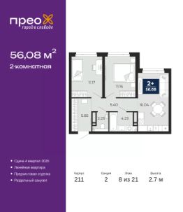 2-комн. квартира от застройщика с предчистовой отделкой в ЖК "Прео" на 8 этаже. Общая площадь: 56.08 кв.м., жилая: 22.33 кв.м., площадь просторной кухни-столовой: 16.04 кв.м. Комнаты изолированные, все окна выходят на одну сторону. В квартире один раздельный санузел. Высота потолков 2.7 м. Дом монолитный, черырехподъездный, переменной этажности, от 14 до 21 этажей. Квартира находится во 2-й секции высотой 21 этаж в корпусе 211. На этаже 10 квартир. В подъезде 1 пассажирский и 1 грузовой лифт. Окончание строительства - 4 квартал 2026 года. Оформление сделки по договору долевого участия. Преображенский — один из самых привлекательных районов для жизни! Это полностью самостоятельный жилой район с точки зрения инфраструктуры. Преображенский находится между Московским и Червишевским трактами в квартале улиц Закалужская — Вьюжная — Александра Протозанова. Не нужно ждать, когда появится инфраструктура — переезжайте на всё готовое. Вблизи расположены действующие школа и детский сад. В этом году откроется еще один сад, а в следующем году — школа. По соседству с Преображенским запланировано строительство городского парка "Комарово" площадью 38 гектар. За 10 минут можно доехать на автомобиле до крупных ТРЦ: "Лента", "Кристалл", "Леруа Мерлен", "Метро" и "Ашан". С 2018 года в районе открыт Соседский центр — пространство, созданное для формирования добрососедской среды, совместного досуга, общения и реализации соседских инициатив. Здесь проходят встречи соседей, а также сами жители района организовывают мероприятия. Организатором такого события может стать любой желающий. В квартирах выполнена качественная предчистовая отделка. Гладкие стены с финишным выравниванием по маякам. Ровный потолок для установки натяжного потолка. Установлены пятикамерные окна с двойным стеклопакетом (3 стекла). Дизайнерские холлы с видеонаблюдением, безбарьерным и прозрачным входом всегда светло и спокойно. На первом этаже есть просторные колясочные, где все жители могут оставлять свои коляски и велосипеды. В Преображенском есть всё, что нужно для активного отдыха и занятий спортом. Мы сделали большое футбольное поле с безопасным покрытием. Также установили хоккейный корт, который оборудован по всем необходимым стандартам. Во дворах можно делать упражнения на специальных площадках с турниками. Весь район мы обустроили велодорожками, которые связаны в единый маршрут. У нас есть сухие фонтаны, бьющие из земли, деревья, веревки, сетки, скалодром, газон, песок и резинка — осталось просто дать своему ребенку право на свободную игру. По-настоящему хорошие дворы — это те, которые дети предпочитают соцсетям и телевизору. Аккредитация в банках: ПАО Банк "ВТБ", "Сбербанк России", ОАО "Альфа-Банк", ПАО "Газпромбанк", ПАО "Банк Уралсиб" и других. #zsoaDT