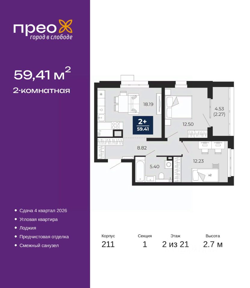Продается 2-комн. квартира с предчистовой отделкой в ЖК "Прео" на 2 этаже. Общая площадь: 59.41 кв.м., жилая: 24.73 кв.м., площадь просторной кухни-столовой: 18.19 кв.м. Угловая квартира, окна oбecпeчивaют paвнoмepнoe ocвeщeниe в тeчeниe дня. В квартире одна лоджия, один совмещенный санузел. Высота потолков 2.7 м.