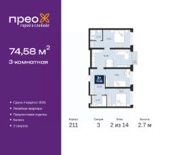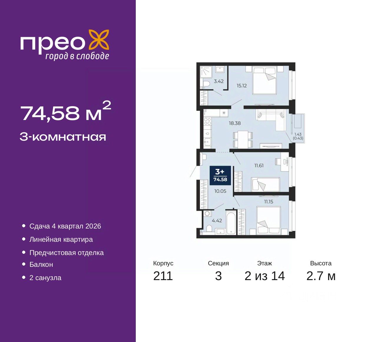 Продается 3-комн. квартира с предчистовой отделкой в ЖК "Прео" на 2 этаже. Общая площадь: 74.58 кв.м., жилая: 37.88 кв.м., площадь просторной кухни-столовой: 18.38 кв.м. Комнаты изолированные, все окна выходят на одну сторону. В квартире один балкон, два совмещенных санузла. Высота потолков 2.7 м.