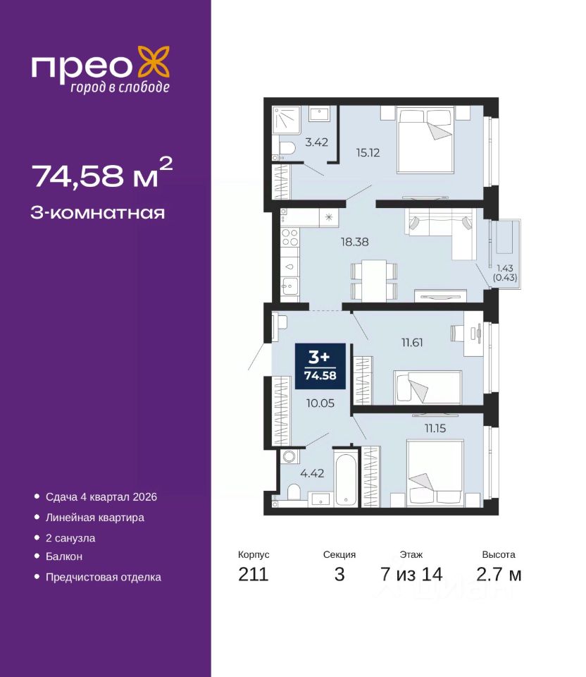 3-комн. квартира с предчистовой отделкой в ЖК "Прео" на 7 этаже. Общая площадь: 74.58 кв.м., жилая: 37.88 кв.м., площадь просторной кухни-столовой: 18.38 кв.м. Комнаты изолированные, все окна выходят на одну сторону. В квартире один балкон, два совмещенных санузла. Высота потолков 2.7 м.