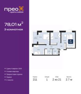 Просторная трехкомнатная квартира с предчистовой отделкой в ЖК "Прео" на 2 этаже. Общая площадь: 78.01 кв.м., жилая: 38.22 кв.м., площадь просторной кухни-столовой: 19.79 кв.м. Угловая квартира, окна oбecпeчивaют paвнoмepнoe ocвeщeниe в тeчeниe дня. В квартире одна лоджия, один совмещенный и один раздельный санузел. Высота потолков 2.7 м.