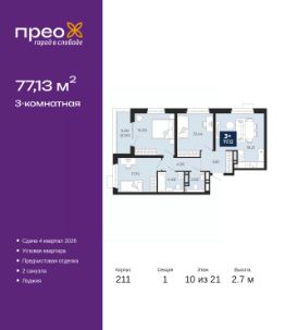 Просторная 3-комн. квартира с предчистовой отделкой в ЖК "Прео" на 10 этаже. Общая площадь: 77.13 кв.м., жилая: 38.22 кв.м., площадь просторной кухни-столовой: 19.21 кв.м. Квартира угловая, идеально подойдет любителям тишины и панорамных видов. В квартире одна лоджия, один совмещенный и один раздельный санузел. Высота потолков 2.7 м.