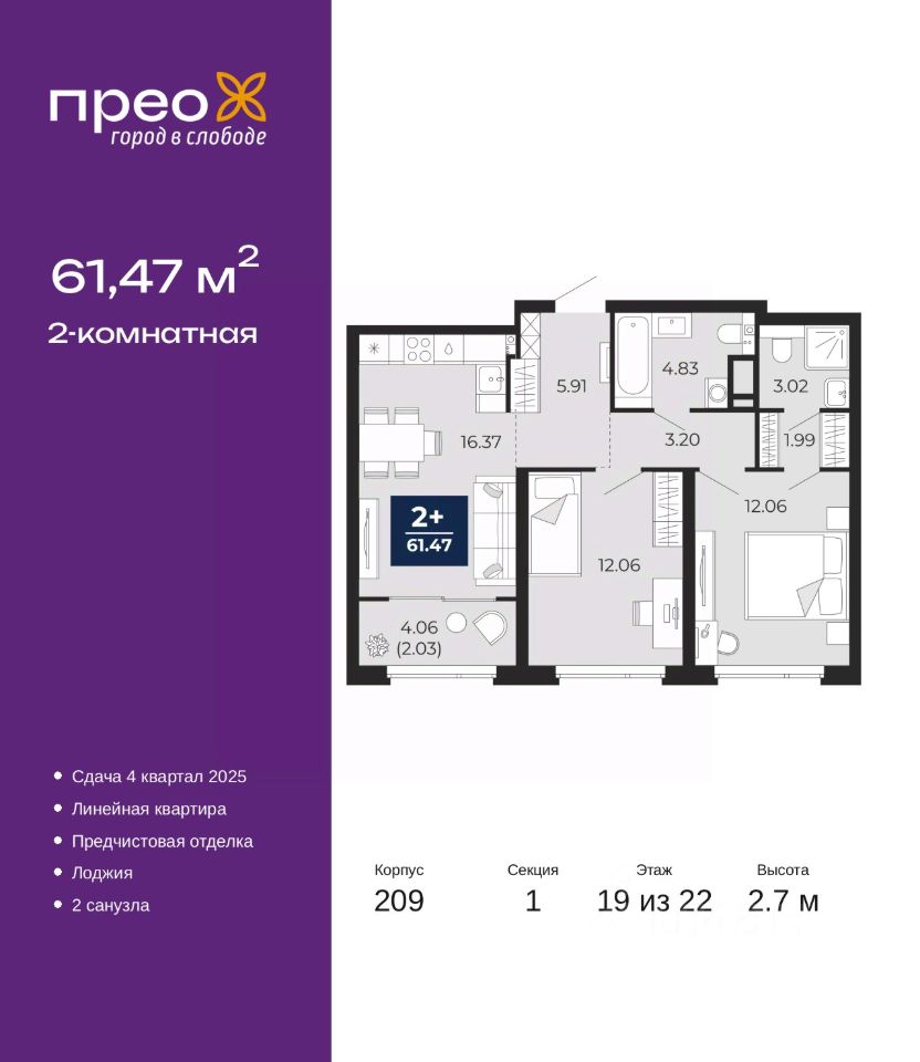 Продается 2-комн. квартира от застройщика с предчистовой отделкой в ЖК "Прео" на 19 этаже. Общая площадь: 61.47 кв.м., жилая: 24.12 кв.м., площадь просторной кухни-столовой: 16.37 кв.м. Комнаты изолированные, все окна выходят на одну сторону. В квартире одна лоджия, два совмещенных санузла. Высота потолков 2.7 м.