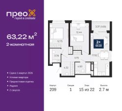 2-комн. квартира от застройщика с предчистовой отделкой в ЖК "Прео" на 15 этаже. Общая площадь: 63.22 кв.м., жилая: 25.19 кв.м., площадь просторной кухни-столовой: 17.92 кв.м. Квартира угловая, идеально подойдет любителям тишины и панорамных видов. В квартире одна лоджия, один совмещенный и один раздельный санузел. Высота потолков 2.7 м.