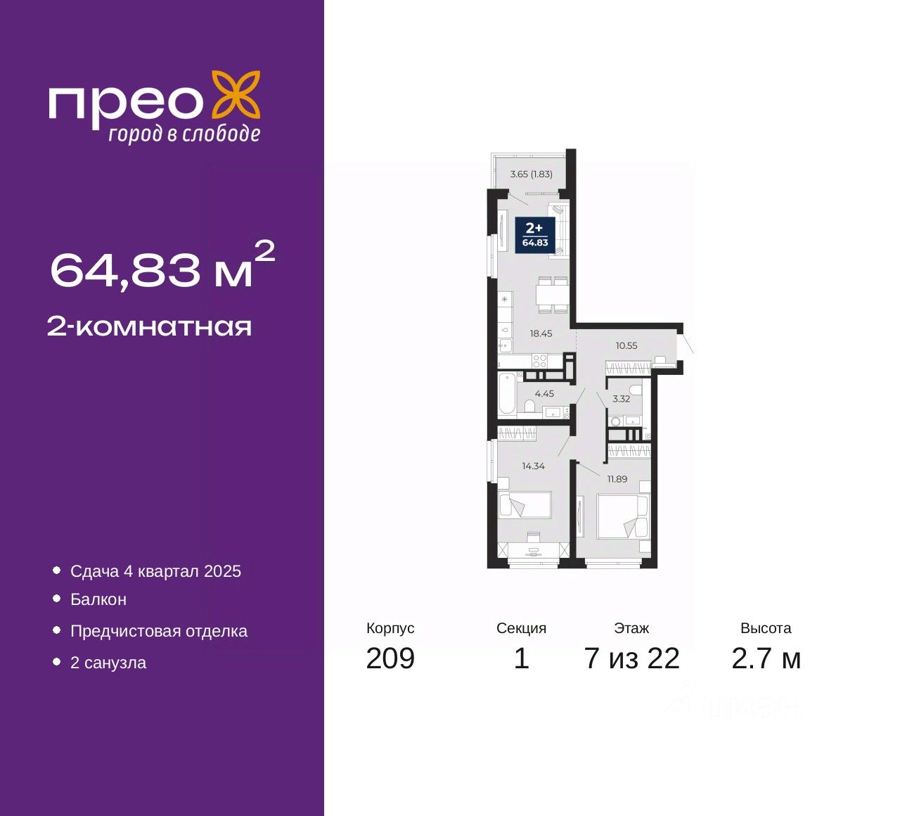 Продается 2-комн. квартира от застройщика с предчистовой отделкой в ЖК "Прео" на 7 этаже. Общая площадь: 64.83 кв.м., жилая: 26.23 кв.м., площадь просторной кухни-столовой: 18.45 кв.м. Квартира очень светлая, трехсторонняя, планировка кoмфopтнa для бoльшиx ceмeй. В квартире один балкон, один совмещенный и один раздельный санузел. Высота потолков 2.7 м.