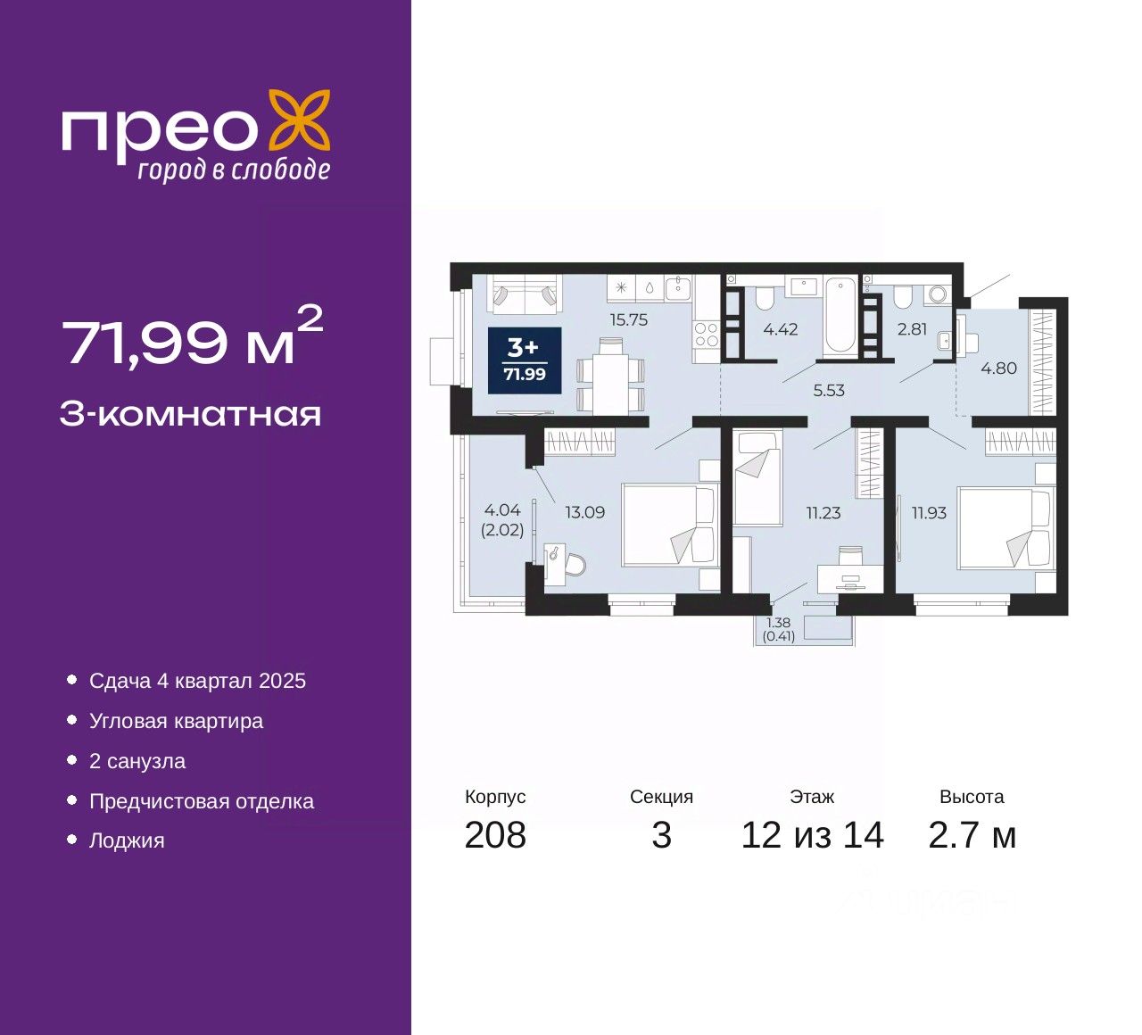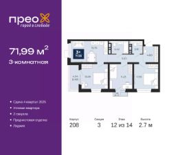 Просторная 3-комн. квартира с предчистовой отделкой в ЖК "Прео" на 12 этаже. Общая площадь: 71.99 кв.м., жилая: 36.25 кв.м., площадь просторной кухни-столовой: 15.75 кв.м. Угловая квартира, идеально подойдет любителям тишины и панорамных видов. В квартире одна лоджия, один совмещенный и один раздельный санузел. Высота потолков 2.7 м.