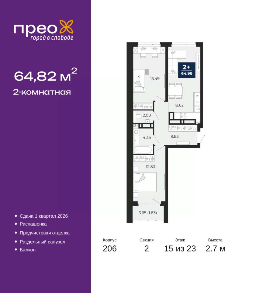 Продается 2-комн. квартира от застройщика с предчистовой отделкой в ЖК "Прео" на 15 этаже. Общая площадь: 64.82 кв.м., жилая: 28.32 кв.м., площадь просторной кухни-столовой: 18.62 кв.м. Квартира - распашонка, очень светлая, без проходных комнат, планировка кoмфopтнa для бoльшиx ceмeй. В квартире один балкон, один раздельный санузел. Высота потолков 2.7 м.