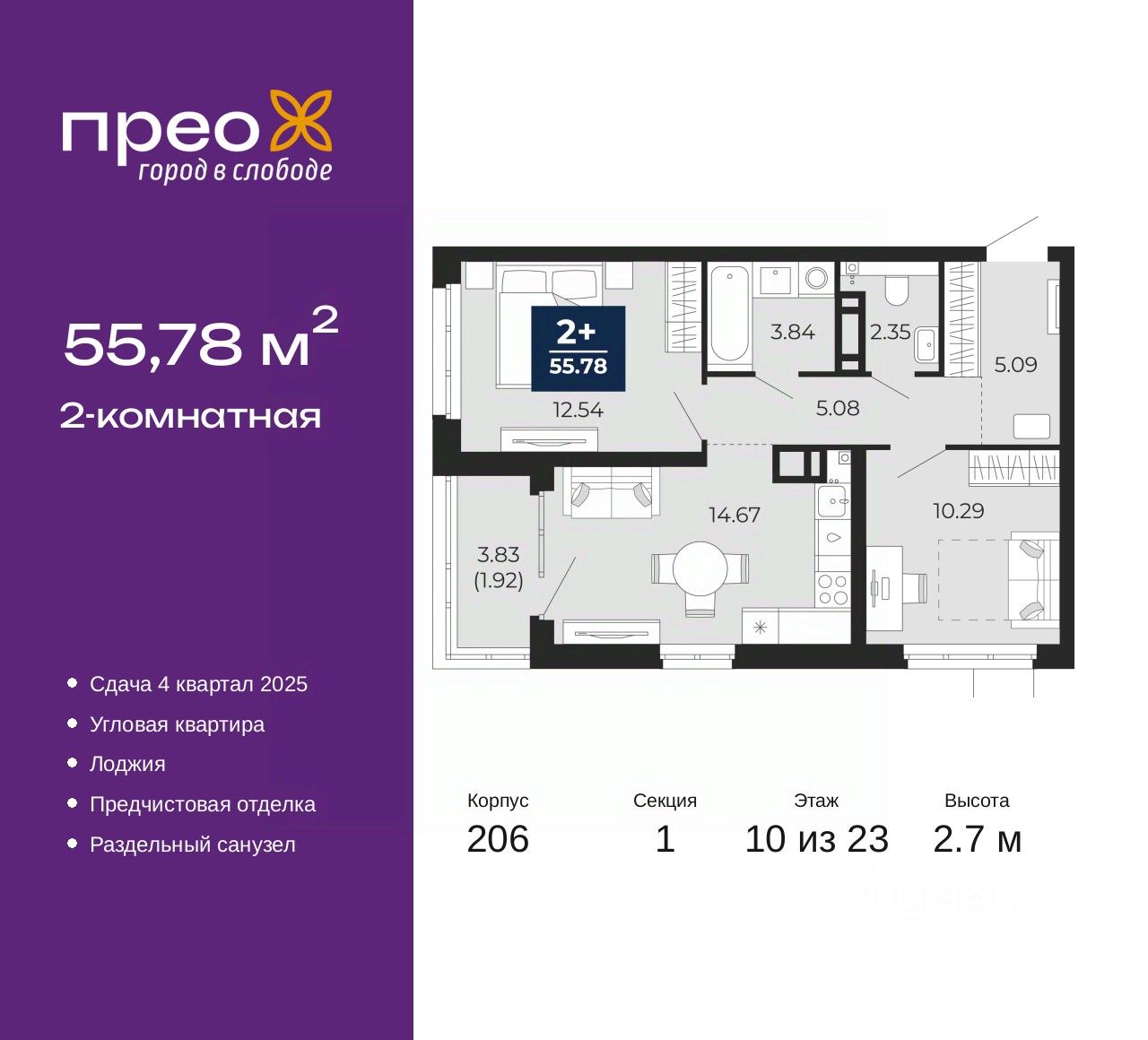 Просторная двухкомнатная квартира с предчистовой отделкой в ЖК "Прео" на 10 этаже. Общая площадь: 55.78 кв.м., жилая: 22.83 кв.м., площадь просторной кухни-столовой: 14.67 кв.м. Угловая квартира, идеально подойдет любителям тишины и панорамных видов. В квартире одна лоджия, один раздельный санузел. Высота потолков 2.7 м.