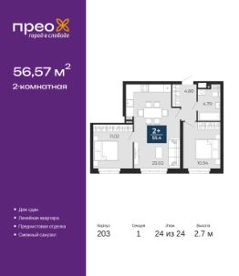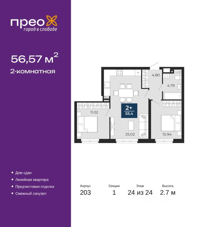 Продается двухкомнатная квартира с предчистовой отделкой в ЖК "Прео" на 24 этаже. Общая площадь: 56.57 кв.м., жилая: 21.96 кв.м., площадь просторной кухни-столовой: 25.02 кв.м. Комнаты изолированные, все окна выходят на одну сторону. В квартире один совмещенный санузел. Высота потолков 2.7 м.