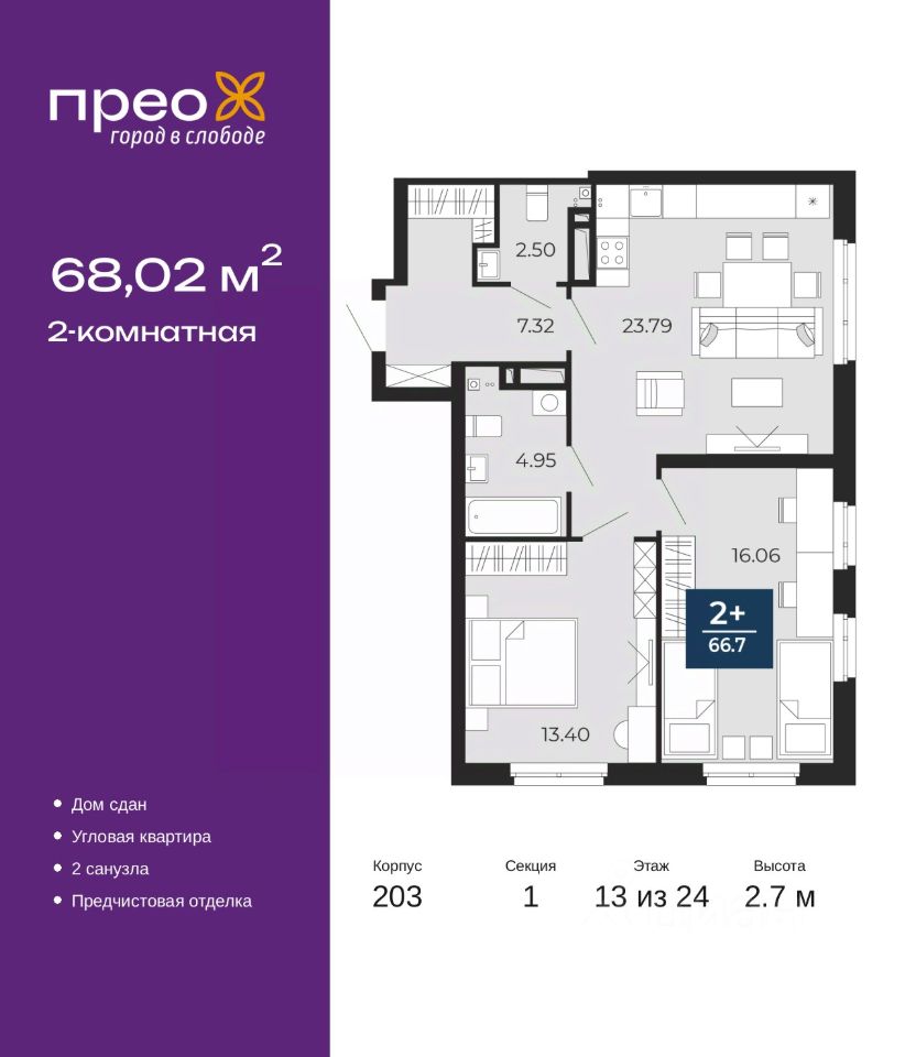 Просторная 2-комн. квартира с предчистовой отделкой в ЖК "Прео" на 13 этаже. Общая площадь: 68.02 кв.м., жилая: 29.46 кв.м., площадь просторной кухни-столовой: 23.79 кв.м. Квартира угловая, окна oбecпeчивaют paвнoмepнoe ocвeщeниe в тeчeниe дня. В квартире один совмещенный и один раздельный санузел. Высота потолков 2.7 м.