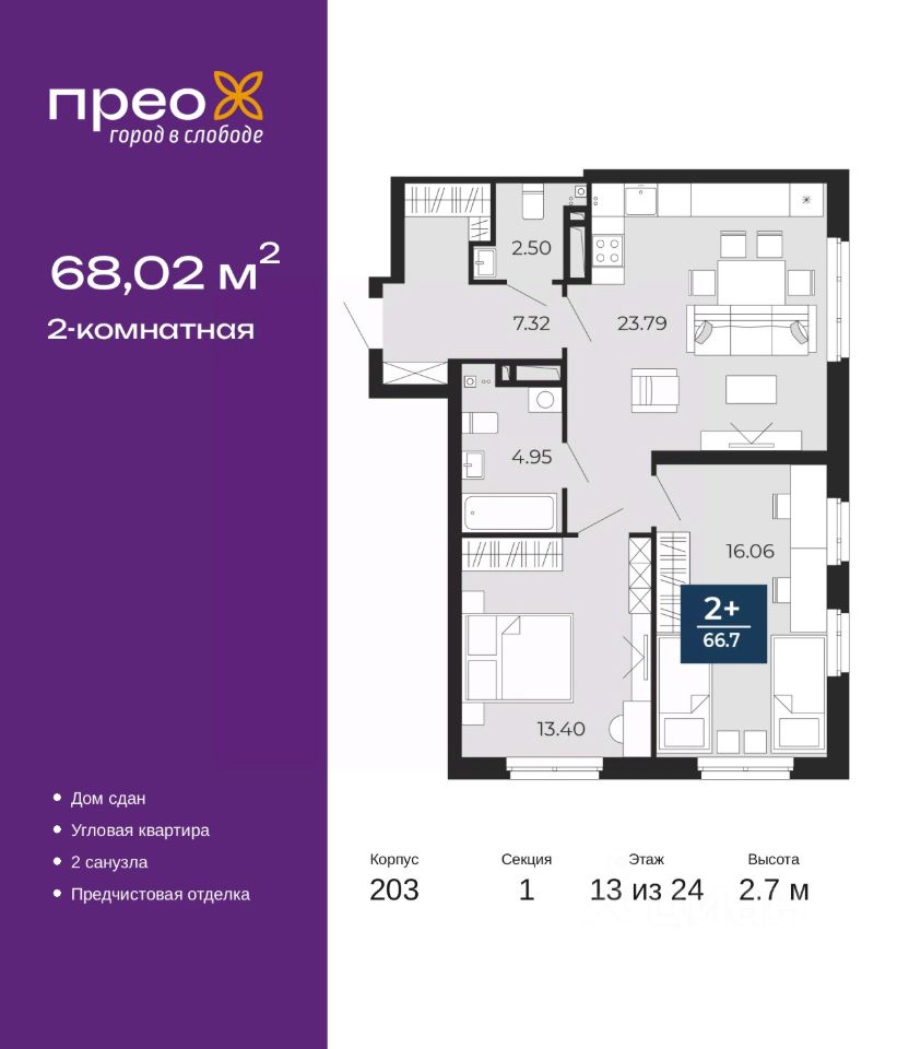 2-комн. квартира от застройщика с предчистовой отделкой в ЖК "Прео" на 13 этаже. Общая площадь: 68.02 кв.м., жилая: 29.46 кв.м., площадь просторной кухни-столовой: 23.79 кв.м. Угловая квартира, очень светлая, естественная вентиляция при открытии окон. В квартире один совмещенный и один раздельный санузел. Высота потолков 2.7 м.