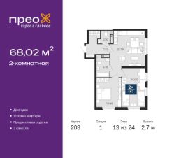 Продается 2-комн. квартира с предчистовой отделкой в ЖК "Прео" на 13 этаже. Общая площадь: 68.02 кв.м., жилая: 29.46 кв.м., площадь просторной кухни-столовой: 23.79 кв.м. Квартира угловая, очень светлая, естественная вентиляция при открытии окон. В квартире один совмещенный и один раздельный санузел. Высота потолков 2.7 м.