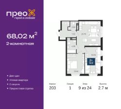 Продается 2-комн. квартира от застройщика с предчистовой отделкой в ЖК "Прео" на 9 этаже. Общая площадь: 68.02 кв.м., жилая: 29.46 кв.м., площадь просторной кухни-столовой: 23.79 кв.м. Квартира угловая, идеально подойдет любителям тишины и панорамных видов. В квартире один совмещенный и один раздельный санузел. Высота потолков 2.7 м.