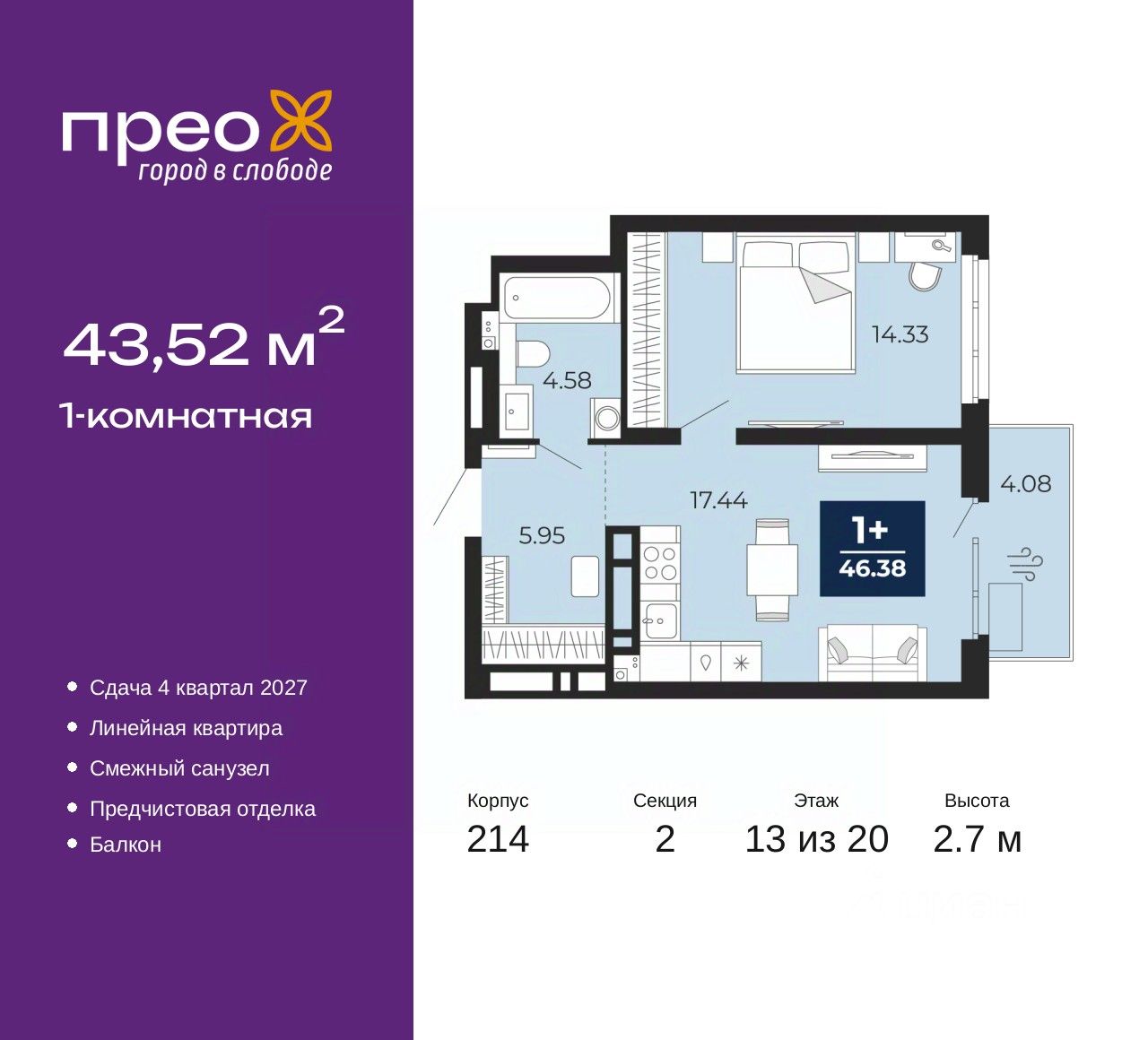 1-комн. квартира от застройщика с предчистовой отделкой в ЖК "Прео" на 13 этаже. Общая площадь: 43.52 кв.м., жилая: 14.33 кв.м., площадь просторной кухни-столовой: 17.44 кв.м. Все окна выходят на одну сторону. В квартире один балкон, один совмещенный санузел. Высота потолков 2.7 м.