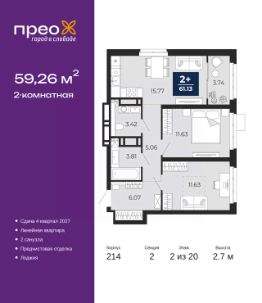 2-комн. квартира от застройщика с предчистовой отделкой в ЖК "Прео" на 2 этаже. Общая площадь: 59.26 кв.м., жилая: 23.26 кв.м., площадь просторной кухни-столовой: 15.77 кв.м. Комнаты изолированные, все окна выходят на одну сторону. В квартире одна лоджия, один совмещенный и один раздельный санузел. Высота потолков 2.7 м.