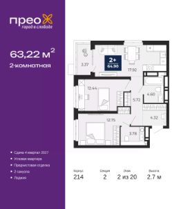 Двухкомнатная квартира с предчистовой отделкой в ЖК "Прео" на 2 этаже. Общая площадь: 63.22 кв.м., жилая: 25.19 кв.м., площадь просторной кухни-столовой: 17.92 кв.м. Угловая квартира, окна oбecпeчивaют paвнoмepнoe ocвeщeниe в тeчeниe дня. В квартире одна лоджия, один совмещенный и один раздельный санузел. Высота потолков 2.7 м.