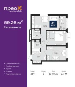Двухкомнатная квартира с предчистовой отделкой в ЖК "Прео" на 13 этаже. Общая площадь: 59.26 кв.м., жилая: 23.26 кв.м., площадь просторной кухни-столовой: 15.77 кв.м. Комнаты изолированные, все окна выходят на одну сторону. В квартире одна лоджия, один совмещенный и один раздельный санузел. Высота потолков 2.7 м.
