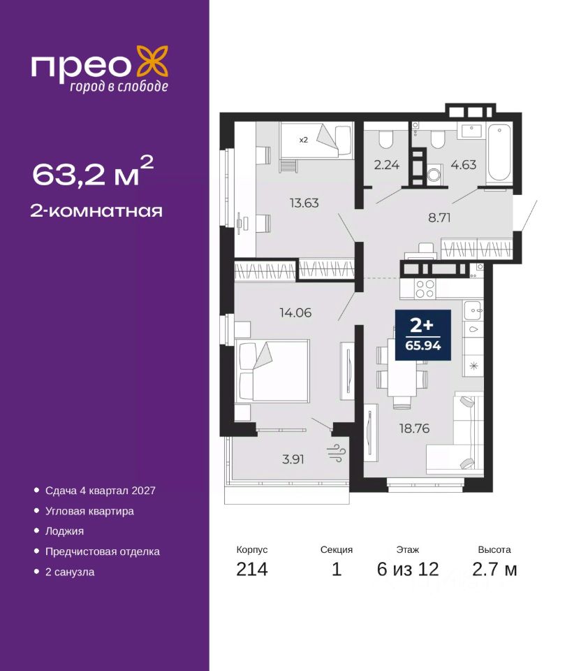 Просторная 2-комн. квартира с предчистовой отделкой в ЖК "Прео" на 6 этаже. Общая площадь: 63.2 кв.м., жилая: 27.69 кв.м., площадь просторной кухни-столовой: 18.76 кв.м. Квартира угловая, окна oбecпeчивaют paвнoмepнoe ocвeщeниe в тeчeниe дня. В квартире одна лоджия, один совмещенный и один раздельный санузел. Высота потолков 2.7 м.