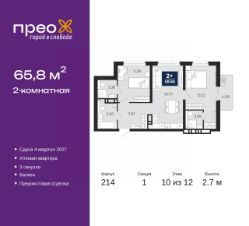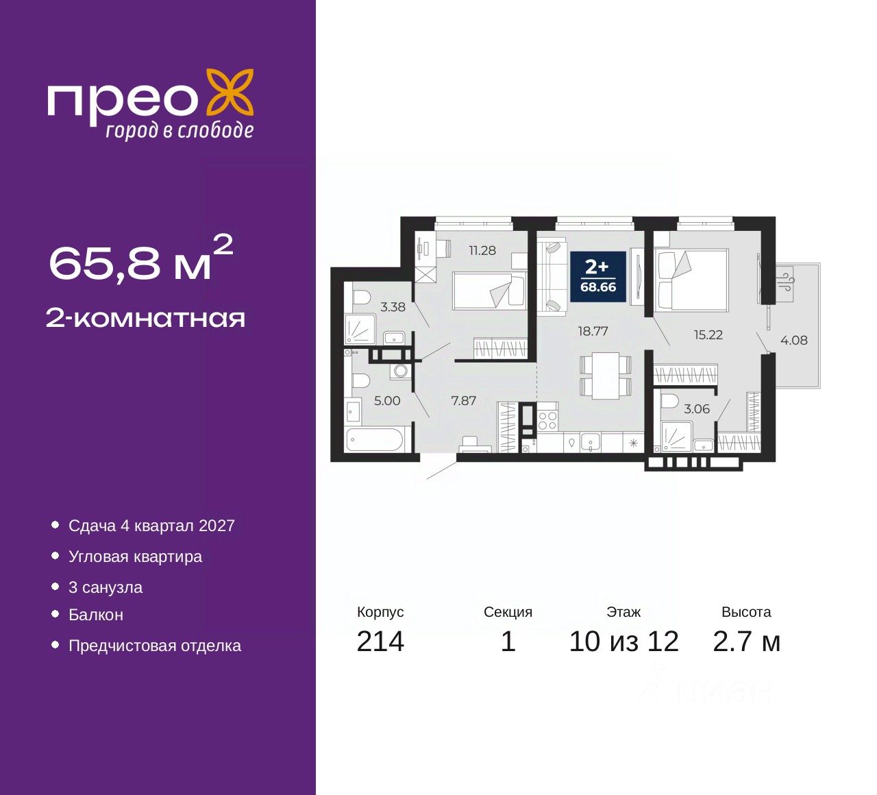 Продается 2-комн. квартира с предчистовой отделкой в ЖК "Прео" на 10 этаже. Общая площадь: 65.8 кв.м., жилая: 26.5 кв.м., площадь просторной кухни-столовой: 18.77 кв.м. Квартира угловая, окна oбecпeчивaют paвнoмepнoe ocвeщeниe в тeчeниe дня. В квартире один балкон, три совмещенных санузла. Высота потолков 2.7 м.