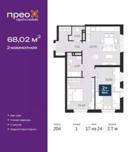 2-комн. квартира с предчистовой отделкой в ЖК "Прео" на 17 этаже. Общая площадь: 68.02 кв.м., жилая: 29.46 кв.м., площадь просторной кухни-столовой: 23.79 кв.м. Квартира угловая, очень светлая, естественная вентиляция при открытии окон. В квартире один совмещенный и один раздельный санузел. Высота потолков 2.7 м.