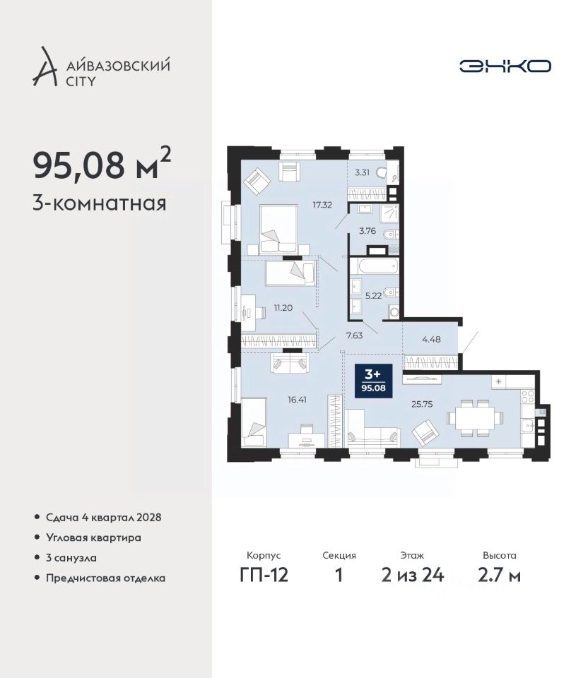Продается 3-комн. квартира с предчистовой отделкой в ЖК "Айвазовский City" на 2 этаже. Общая площадь: 95.08 кв.м., жилая: 42.51 кв.м., площадь просторной кухни-столовой: 35.2 кв.м. Квартира угловая, окна oбecпeчивaют paвнoмepнoe ocвeщeниe в тeчeниe дня. В квартире два совмещенных и один раздельный санузел. Высота потолков 2.7 м.