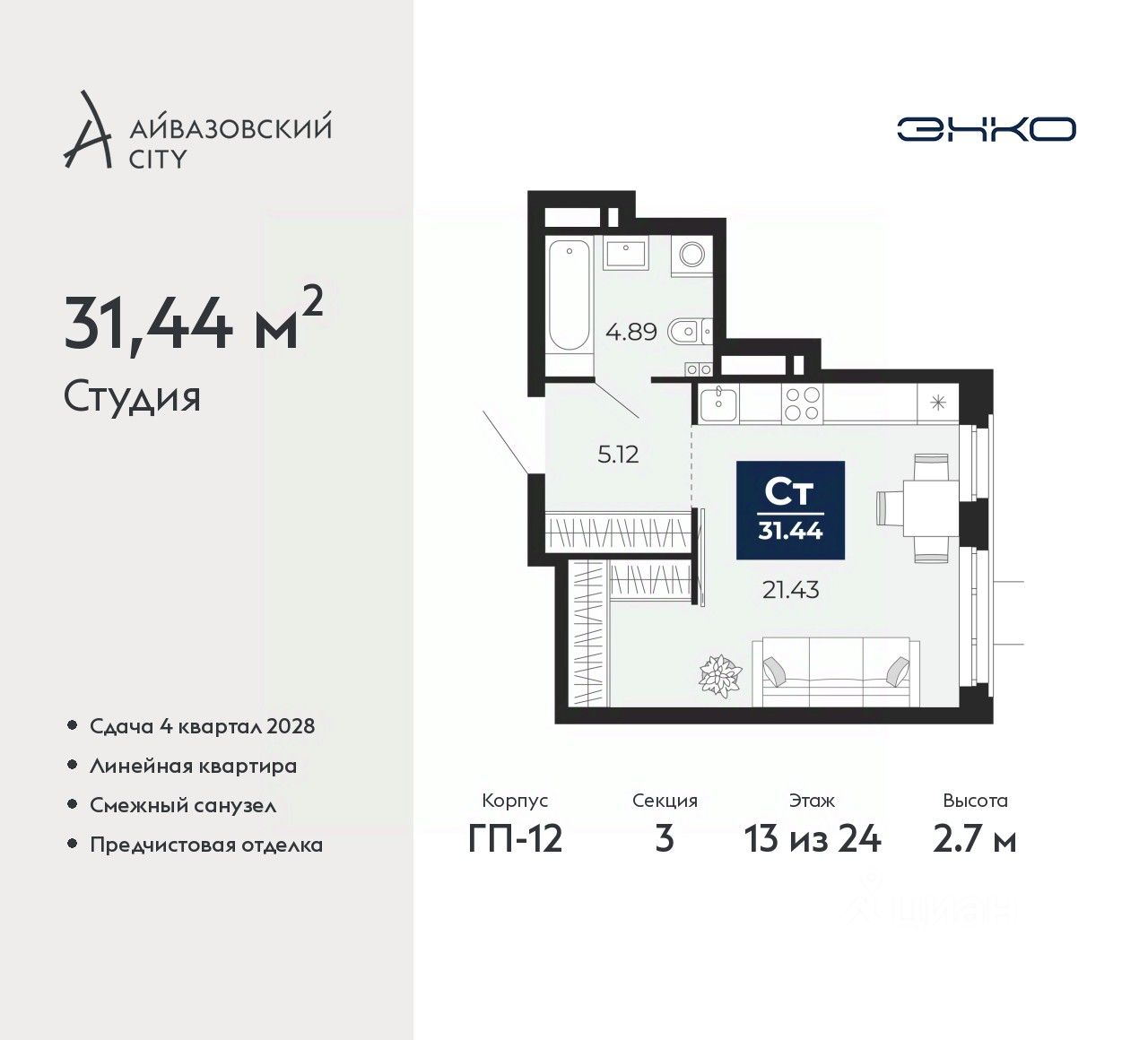 Однокомнатная квартира-студия от застройщика с предчистовой отделкой в ЖК "Айвазовский City" на 13 этаже. Общая площадь: 31.44 кв.м., площадь гостиной 21.43 кв.м., из которых 5 кв.м. выделено под кухонную зону. Все окна выходят на одну сторону. В квартире один совмещенный санузел. Высота потолков 2.7 м.