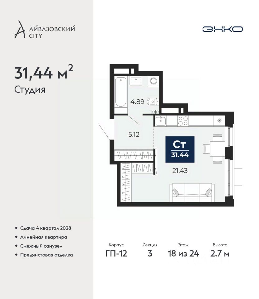 Однокомнатная квартира-студия от застройщика с предчистовой отделкой в ЖК "Айвазовский City" на 18 этаже. Общая площадь: 31.44 кв.м., площадь гостиной 21.43 кв.м., из которых 5 кв.м. выделено под кухонную зону. Все окна выходят на одну сторону. В квартире один совмещенный санузел. Высота потолков 2.7 м.