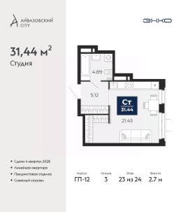 Продается 1-комн. квартира-студия с предчистовой отделкой в ЖК "Айвазовский City" на 23 этаже. Общая площадь: 31.44 кв.м., площадь гостиной 21.43 кв.м., из которых 5 кв.м. выделено под кухонную зону. Все окна выходят на одну сторону. В квартире один совмещенный санузел. Высота потолков 2.7 м.