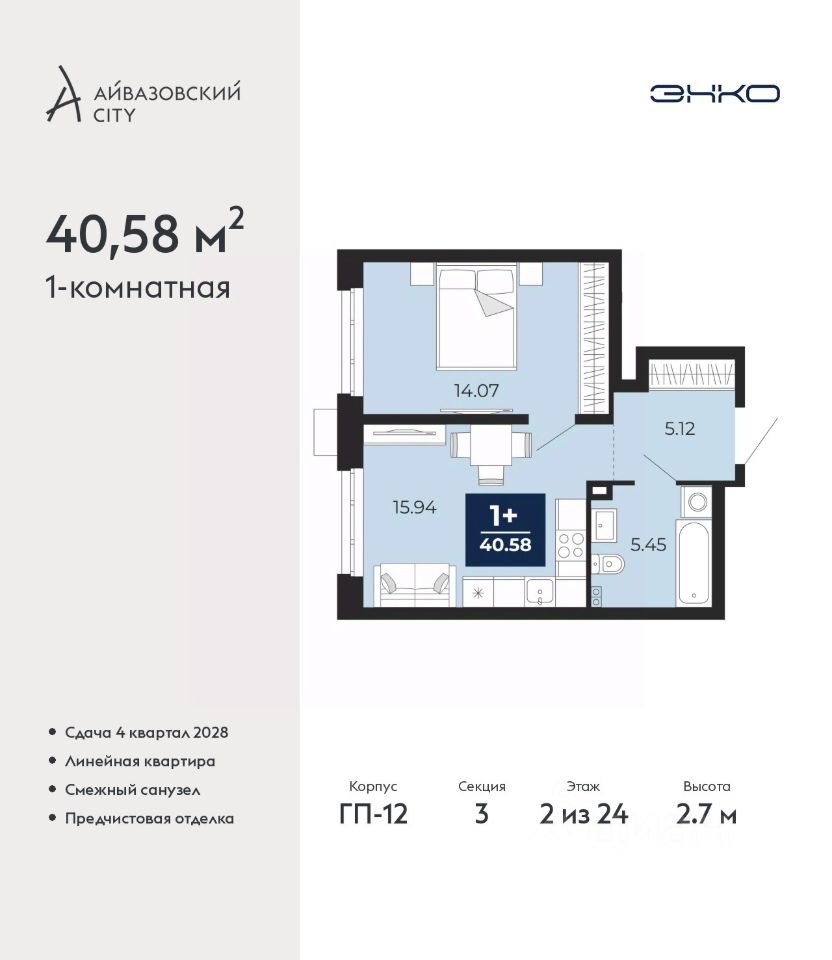 1-комн. квартира от застройщика с предчистовой отделкой в ЖК "Айвазовский City" на 2 этаже. Общая площадь: 40.58 кв.м., жилая: 14.07 кв.м., площадь просторной кухни-столовой: 15.94 кв.м. Все окна выходят на одну сторону. В квартире один совмещенный санузел. Высота потолков 2.7 м.