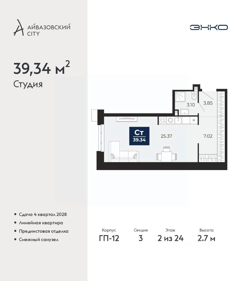 Просторная однокомнатная квартира-студия с предчистовой отделкой в ЖК "Айвазовский City" на 2 этаже. Общая площадь: 39.34 кв.м., площадь гостиной 26.37 кв.м., из которых 6 кв.м. выделено под кухонную зону. Все окна выходят на одну сторону. В квартире один совмещенный санузел. Высота потолков 2.7 м.