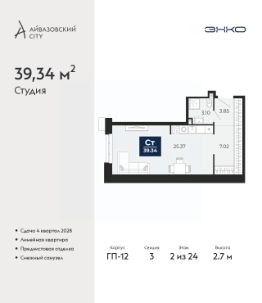 Продается 1-комн. квартира-студия с предчистовой отделкой в ЖК "Айвазовский City" на 2 этаже. Общая площадь: 39.34 кв.м., площадь гостиной 26.37 кв.м., из которых 6 кв.м. выделено под кухонную зону. Все окна выходят на одну сторону. В квартире один совмещенный санузел. Высота потолков 2.7 м.