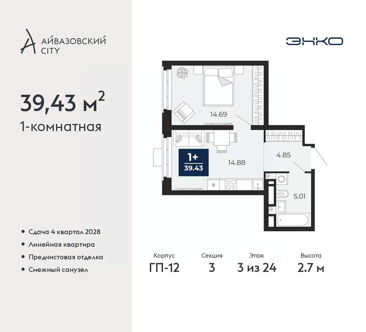 1-комн. квартира с предчистовой отделкой в ЖК "Айвазовский City" на 3 этаже. Общая площадь: 39.43 кв.м., жилая: 14.69 кв.м., площадь просторной кухни-столовой: 14.88 кв.м. Все окна выходят на одну сторону. В квартире один совмещенный санузел. Высота потолков 2.7 м.