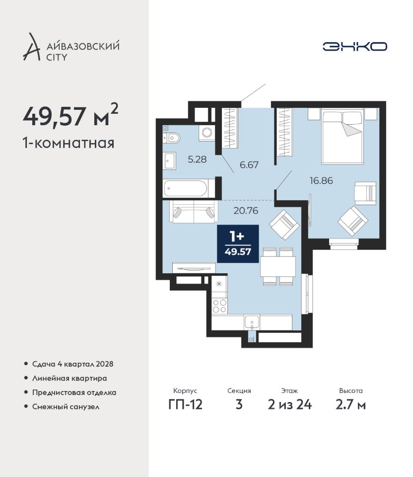 Продается 1-комн. квартира с предчистовой отделкой в ЖК "Айвазовский City" на 2 этаже. Общая площадь: 49.57 кв.м., жилая: 16.86 кв.м., площадь просторной кухни-столовой: 20.76 кв.м. Все окна выходят на одну сторону. В квартире один совмещенный санузел. Высота потолков 2.7 м.