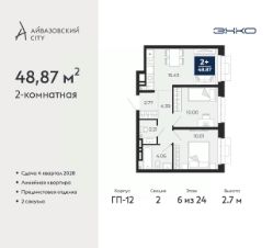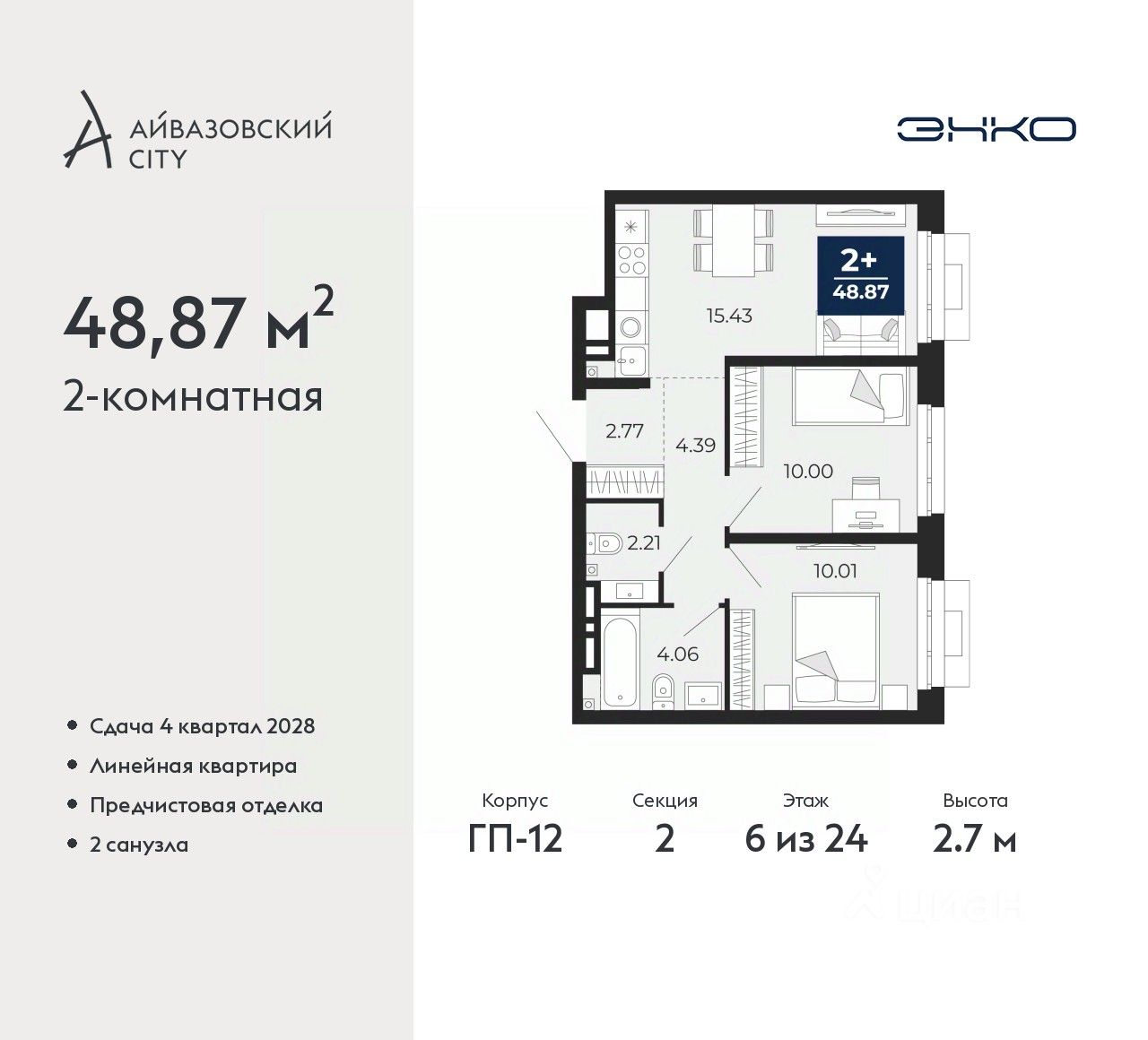 Двухкомнатная квартира с предчистовой отделкой в ЖК "Айвазовский City" на 6 этаже. Общая площадь: 48.87 кв.м., жилая: 20.01 кв.м., площадь просторной кухни-столовой: 15.43 кв.м. Комнаты изолированные, все окна выходят на одну сторону. В квартире один совмещенный и один раздельный санузел. Высота потолков 2.7 м.