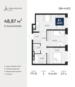 2-комн. квартира с предчистовой отделкой в ЖК "Айвазовский City" на 6 этаже. Общая площадь: 48.87 кв.м., жилая: 20.01 кв.м., площадь просторной кухни-столовой: 15.43 кв.м. Комнаты изолированные, все окна выходят на одну сторону. В квартире один совмещенный и один раздельный санузел. Высота потолков 2.7 м.
