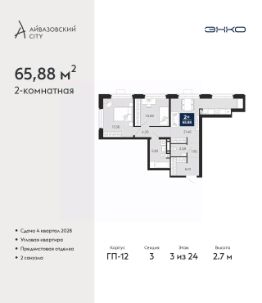 Продается 2-комн. квартира от застройщика с предчистовой отделкой в ЖК "Айвазовский City" на 3 этаже. Общая площадь: 65.88 кв.м., жилая: 24.19 кв.м., площадь просторной кухни-столовой: 21.46 кв.м. Угловая квартира, окна oбecпeчивaют paвнoмepнoe ocвeщeниe в тeчeниe дня. В квартире один совмещенный и один раздельный санузел. Высота потолков 2.7 м.