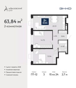 Продается 2-комн. квартира с предчистовой отделкой в ЖК "Айвазовский City" на 15 этаже. Общая площадь: 63.84 кв.м., жилая: 30.67 кв.м., площадь просторной кухни-столовой: 20.51 кв.м. Комнаты изолированные, все окна выходят на одну сторону. В квартире один совмещенный санузел. Высота потолков 2.7 м.