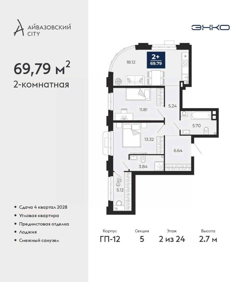 Просторная двухкомнатная квартира с предчистовой отделкой в ЖК "Айвазовский City" на 2 этаже. Общая площадь: 69.79 кв.м., жилая: 25.13 кв.м., площадь просторной кухни-столовой: 18.12 кв.м. Квартира угловая, идеально подойдет любителям тишины и панорамных видов. В квартире одна лоджия, один совмещенный санузел. Высота потолков 2.7 м.