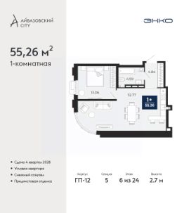 1-комн. квартира с предчистовой отделкой в ЖК "Айвазовский City" на 6 этаже. Общая площадь: 55.26 кв.м., жилая: 13.06 кв.м., площадь просторной кухни-столовой: 32.77 кв.м. Угловая квартира, идеально подойдет любителям тишины и панорамных видов. В квартире один совмещенный санузел. Высота потолков 2.7 м.