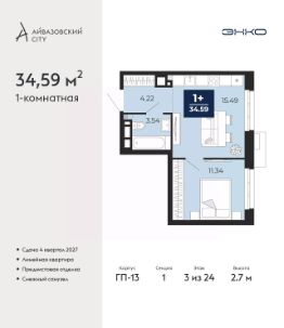 1-комн. квартира от застройщика с предчистовой отделкой в ЖК "Айвазовский City" на 3 этаже. Общая площадь: 34.59 кв.м., жилая: 11.34 кв.м., площадь просторной кухни-столовой: 15.49 кв.м. Все окна выходят на одну сторону. В квартире один совмещенный санузел. Высота потолков 2.7 м.