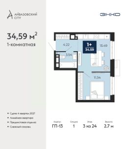 Просторная однокомнатная квартира с предчистовой отделкой в ЖК "Айвазовский" на 3 этаже. Общая площадь: 34.59 кв.м., жилая: 11.34 кв.м., площадь просторной кухни-столовой: 15.49 кв.м. Все окна выходят на одну сторону. В квартире один совмещенный санузел. Высота потолков 2.7 м.