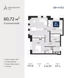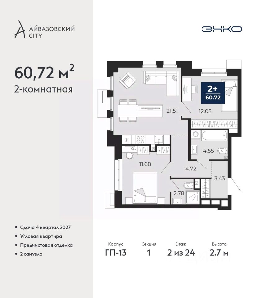 2-комн. квартира с предчистовой отделкой в ЖК "Айвазовский City" на 2 этаже. Общая площадь: 60.72 кв.м., жилая: 23.73 кв.м., площадь просторной кухни-столовой: 21.51 кв.м. Квартира угловая, идеально подойдет любителям тишины и панорамных видов. В квартире два совмещенных санузла. Высота потолков 2.7 м.