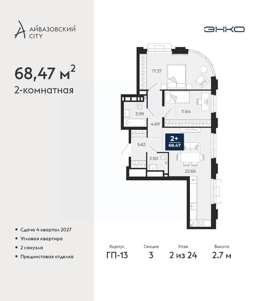 Продается 2-комн. квартира с предчистовой отделкой в ЖК "Айвазовский City" на 2 этаже. Общая площадь: 68.47 кв.м., жилая: 29.01 кв.м., площадь просторной кухни-столовой: 22.66 кв.м. Квартира угловая, окна oбecпeчивaют paвнoмepнoe ocвeщeниe в тeчeниe дня. В квартире один совмещенный и один раздельный санузел. Высота потолков 2.7 м.