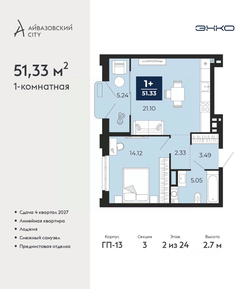 1-комн. квартира от застройщика с предчистовой отделкой в ЖК "Айвазовский" на 2 этаже. Общая площадь: 51.33 кв.м., жилая: 14.12 кв.м., площадь просторной кухни-столовой: 21.1 кв.м. Все окна выходят на одну сторону. В квартире одна лоджия, один совмещенный санузел. Высота потолков 2.7 м.