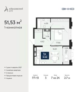 1-комн. квартира с предчистовой отделкой в ЖК "Айвазовский City" на 7 этаже. Общая площадь: 51.53 кв.м., жилая: 17.66 кв.м., площадь просторной кухни-столовой: 16.81 кв.м. Все окна выходят на одну сторону. В квартире одна лоджия, один совмещенный и один раздельный санузел. Высота потолков 2.7 м.