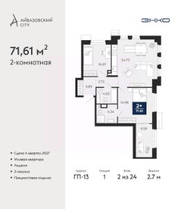 2-комн. квартира с предчистовой отделкой в ЖК "Айвазовский City" на 2 этаже. Общая площадь: 71.61 кв.м., жилая: 25.33 кв.м., площадь просторной кухни-столовой: 24.73 кв.м. Угловая квартира, идеально подойдет любителям тишины и панорамных видов. В квартире одна лоджия, два совмещенных санузла. Высота потолков 2.7 м.