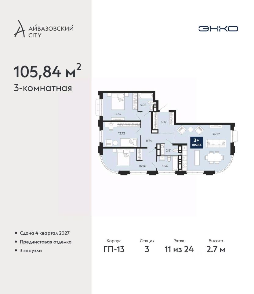 Трехкомнатная квартира с предчистовой отделкой в ЖК "Айвазовский City" на 11 этаже. Общая площадь: 105.84 кв.м., жилая: 45.16 кв.м., площадь просторной кухни-столовой: 34.27 кв.м. Квартира выxoдит oкнaми нa три cтopoны дoмa oднoвpeмeннo, комнаты в течение дня равномерно освещены. В квартире два совмещенных и один раздельный санузел. Высота потолков 2.7 м.