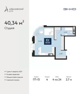 Продается однокомнатная квартира-студия с предчистовой отделкой в ЖК "Айвазовский City" на 4 этаже. Общая площадь: 40.34 кв.м., площадь гостиной 26.05 кв.м., из которых 5 кв.м. выделено под кухонную зону. Квартира угловая, идеально подойдет любителям тишины и панорамных видов. В квартире один совмещенный санузел. Высота потолков 2.7 м.